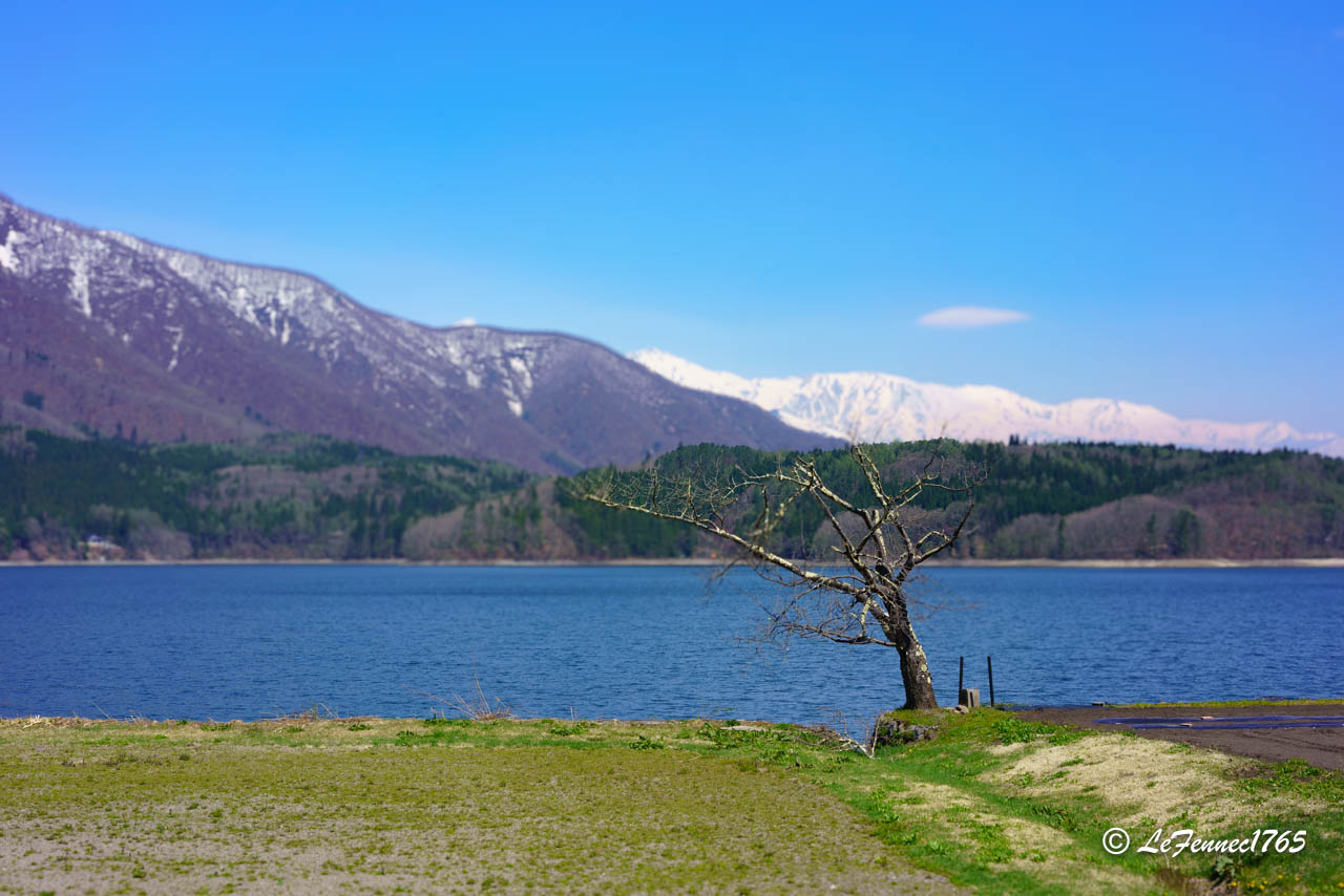 佐野坂峠を越えてすぐ、仁科三湖の中で最も大きい青木湖*1。山寄りの新道が開通し走ることが稀になった湖畔の道のそばにソメイヨシノが佇んでいて白馬の山々を背景に花を咲かせていましたが枯れてしまったそうです。