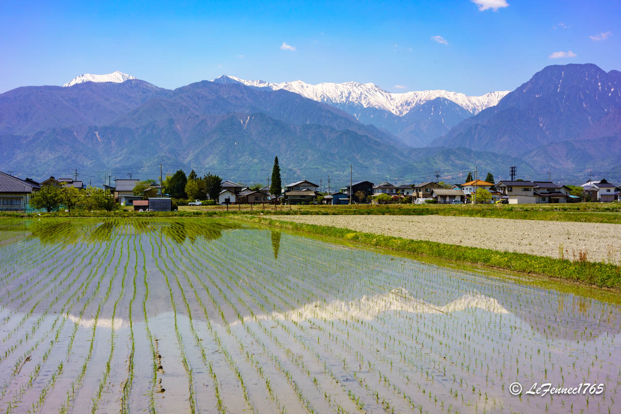 水鏡に映る爺ヶ岳から鹿島槍ヶ岳、五竜、白馬三山の峰々。毎年毎年、何度見ても飽きることがありません。
